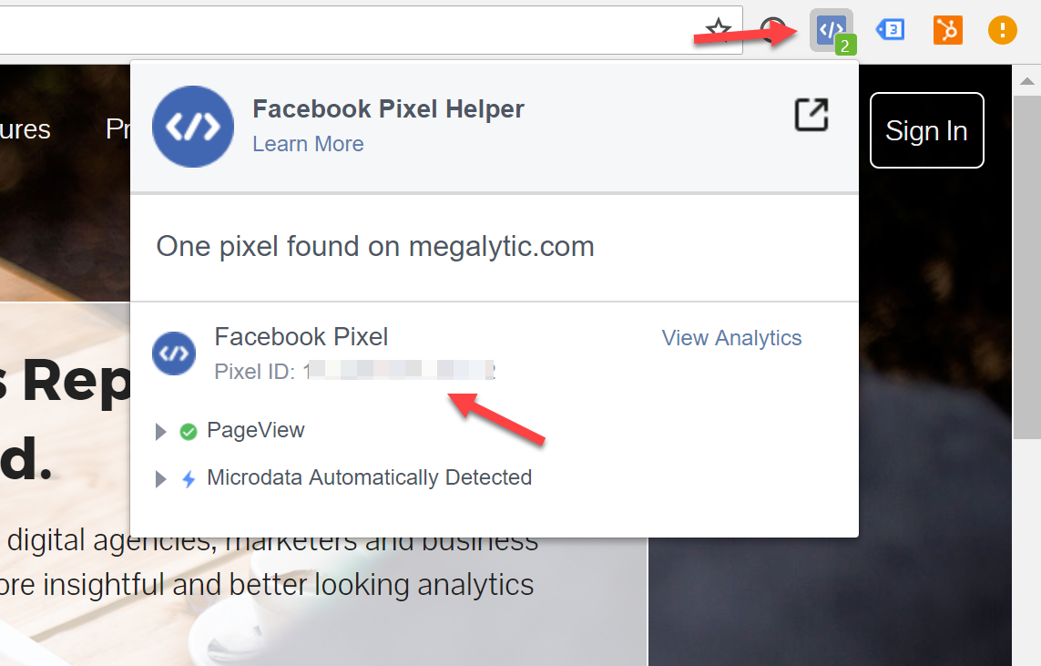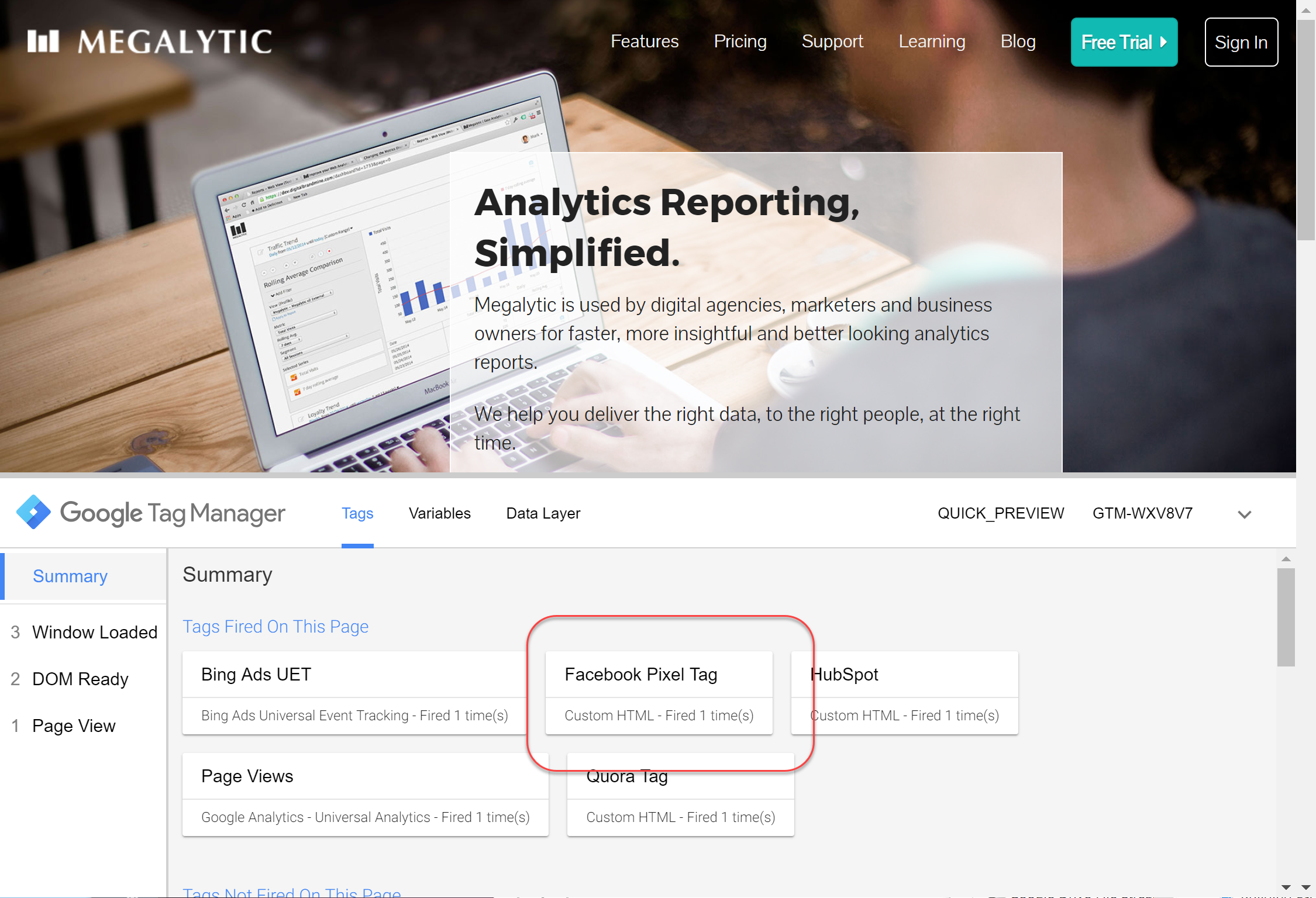 In our example, we can see that the Facebook Pixel Tag has fired on the Megalytic website.