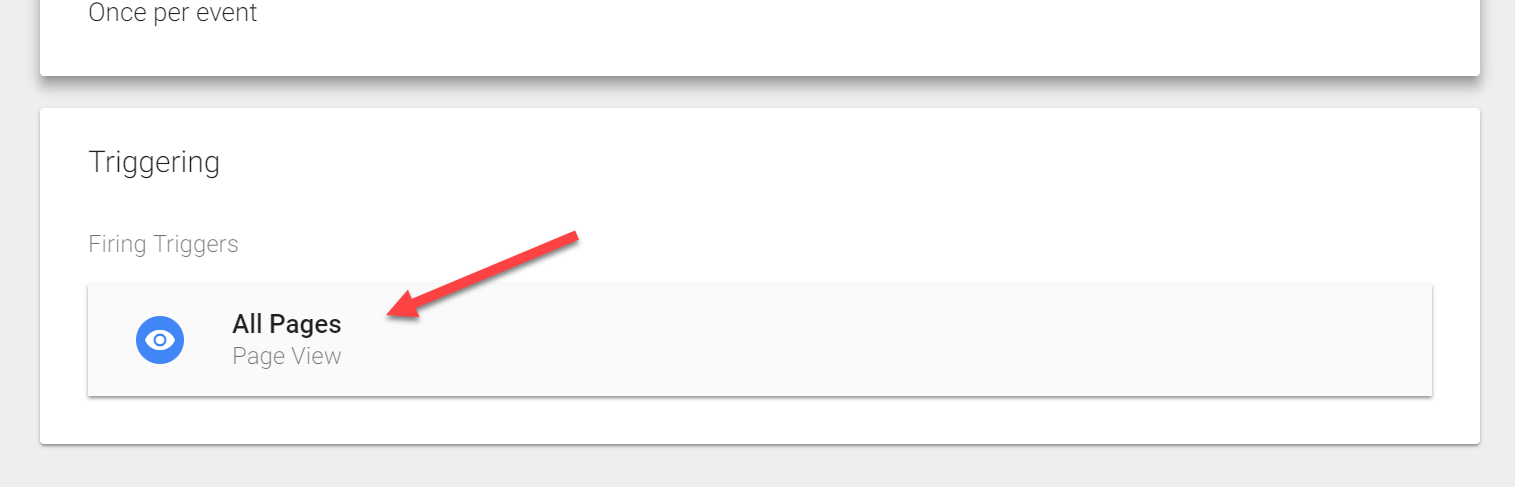Once you’ve arrived here, scroll down to the box labeled “Triggering.” This defines when the Facebook Pixel code will be run (or be “fired”). As you can see, it is set to fire on All Pages. This is the default recommended behavior for the Facebook Pixel, which works successfully in most cases.
