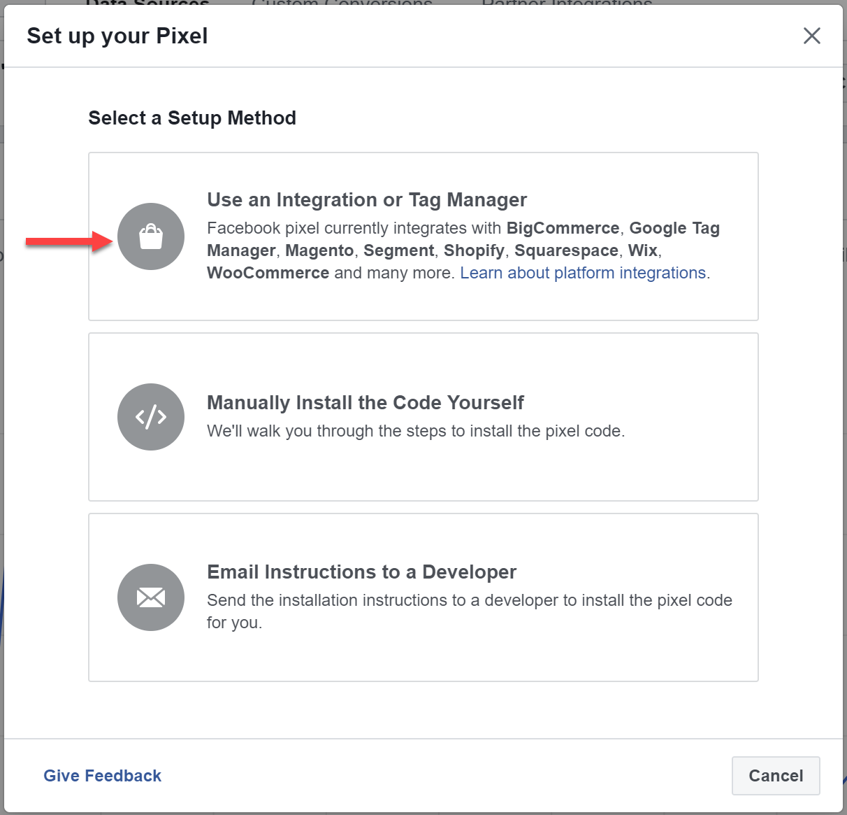 Once your pixel is set up, a dialog box will appear. Choose “Use an Integration or Tag Manager.” This will make the process a lot easier because rather than requiring you to copy and paste code, it uses automation technology to automatically integrate Facebook’s pixel code into your GTM account.