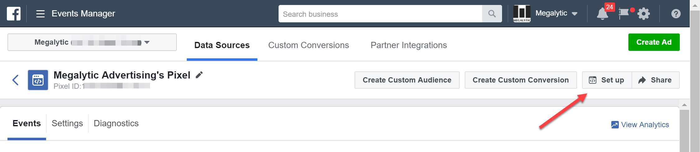 Your first step to installing GTM is to get the Facebook pixel code so you can then use GTM to install it. To do this, log in to your Facebook Business Manager account and open Events Manager > Pixels