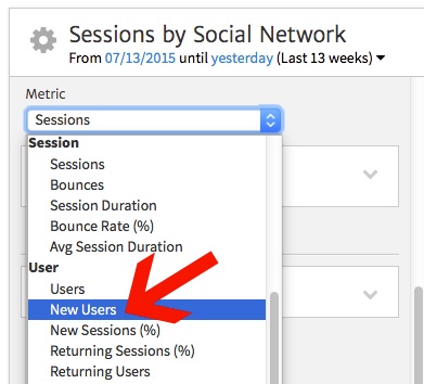 Under the “Metric” dropdown, you can now switch to a different metric from the default Sessions. For instance, you may want to show total Users or New Users, as opposed to showing Sessions (which can count the same Users coming back multiple times). In this case, we’ll select New Users to show a count of individuals who have discovered the site via social media.