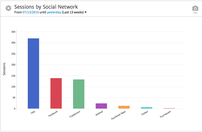 Our final widget now shows a breakdown of New Users by the social networks we’ve chosen, customized with the values on bars. We can see that Yelp still ranks first, followed by TripAdvisor. This makes sense as many restaurant searches now originate from Yelp.