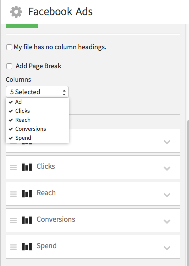 If your file contains a header row (e.g., Clicks, Reach, etc.), leave the “My file has no column headings” unchecked. That way, the widget will format the top row differently, as headings. Once you click “Save,” you’ll now see the data from your file shown in the widget.