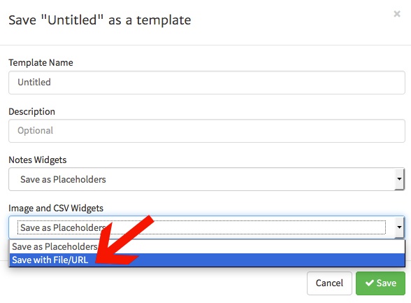 In order to preserve the file link in your templates, be sure to choose the option to “Save with File/URL” while saving the template, as shown below. Now, when you create your next report using the same template, this widget will automatically pull fresh data from the same CSV file.