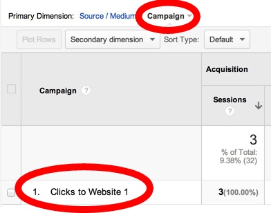 Now, if you click through on the "facebook/cpm" row in Google Analytics, you can see the campaign information that you entered in the Google URL builder. Make sure that you select "Campaign" as the Primary Dimension in the Google Analytics report. This will show you the name of your campaign. As you can see below, it shows clicks coming from the "Clicks to Website 1" campaign - which is what we entered into the Google URL builder.