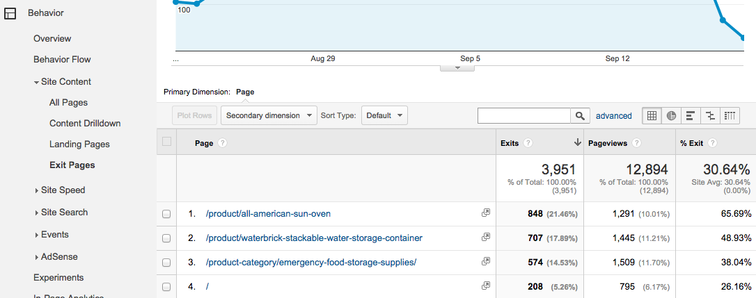 To examine a list of top exit pages, navigate to Behavior > Site Content > Exit Pages. This report shows the number of exits and exit rate for each page. By default, it lists the pages with the highest exit volume first. Unfortunately, you can’t do a Weighted Sort for exit rate the way you can with bounce rate, but you can still get a good picture of high exit pages by sorting for exits and eyeing the exit rate column.