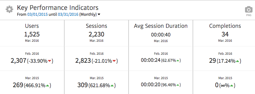 In this case, we’re showing Users, Sessions, Avg. Session Duration, and Completions. These metrics will prove representative of total traffic, engagement, and lead generation for this site.