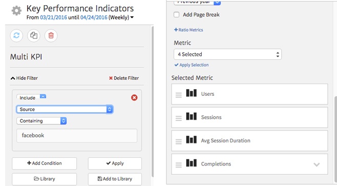 Choose the Multi KPI widget and select the corresponding Analytics account. By default, we see all data from the account, so we’ll want to add a filter to include only Facebook data.