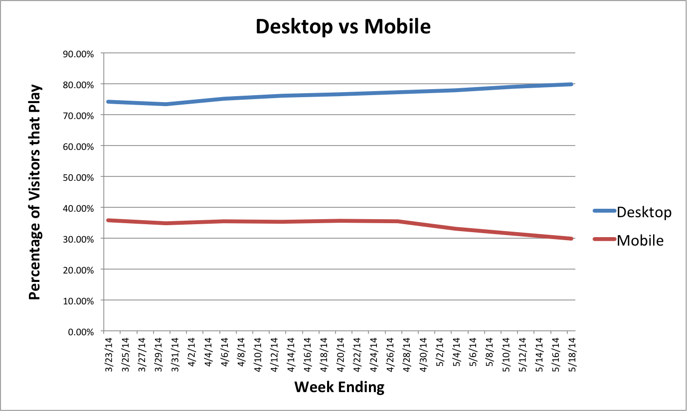 - The play percentage is trending up on desktops, but down on mobile devices.