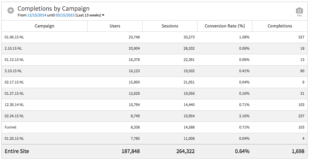 For example, the Megalytic widget below shows conversions by campaign, broken down by newsletters sent out on various dates. January 6 (marked 01.06.15 NL) shows the most conversions, while February 24 (02.24.15 NL) shows the highest conversion rate. This demonstrates that the content in these two newsletters worked best in driving people to convert on the site.
