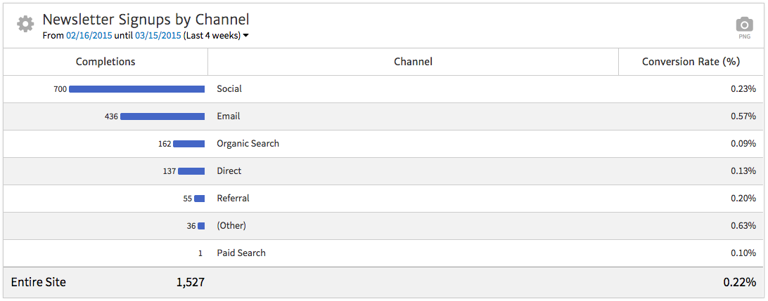 The example below, created in Megalytic, shows newsletter signups by channel. Here, we can show the client that the most signups came from social media referrals, with email being second (possibly due to existing subscribers forwarding on a newsletter to friends).
