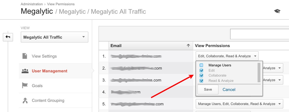 In an agency setting, many people may require access to Google Analytics. You’ll want to balance transparency of sharing data with not handing over full control to someone who shouldn’t be able to edit accounts.