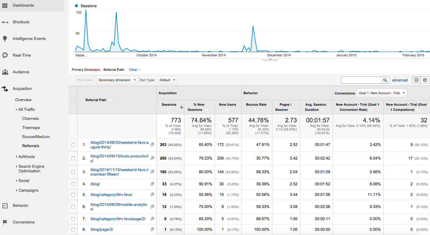 In addition to our blog brand building, Megalytic has been proactive about contributing content to relevant blogs and news outlets. One blog where I was honored to contribute was Duct Tape Marketing (see my post: The Top Google Analytics Reports for Assessing Mobile Activity). This type of outreach is a great way to build connections, as well as to expose your brand to a much larger audience. Megalytic has received both significant traffic and free trial signups as a result of multiple mentions on Duct Tape Marketing. To look at results from this specific site, we’ll go to Acquisition > All Traffic > Referrals. Once here, we can immediately see ducttapemarketing.com as the top referring site.