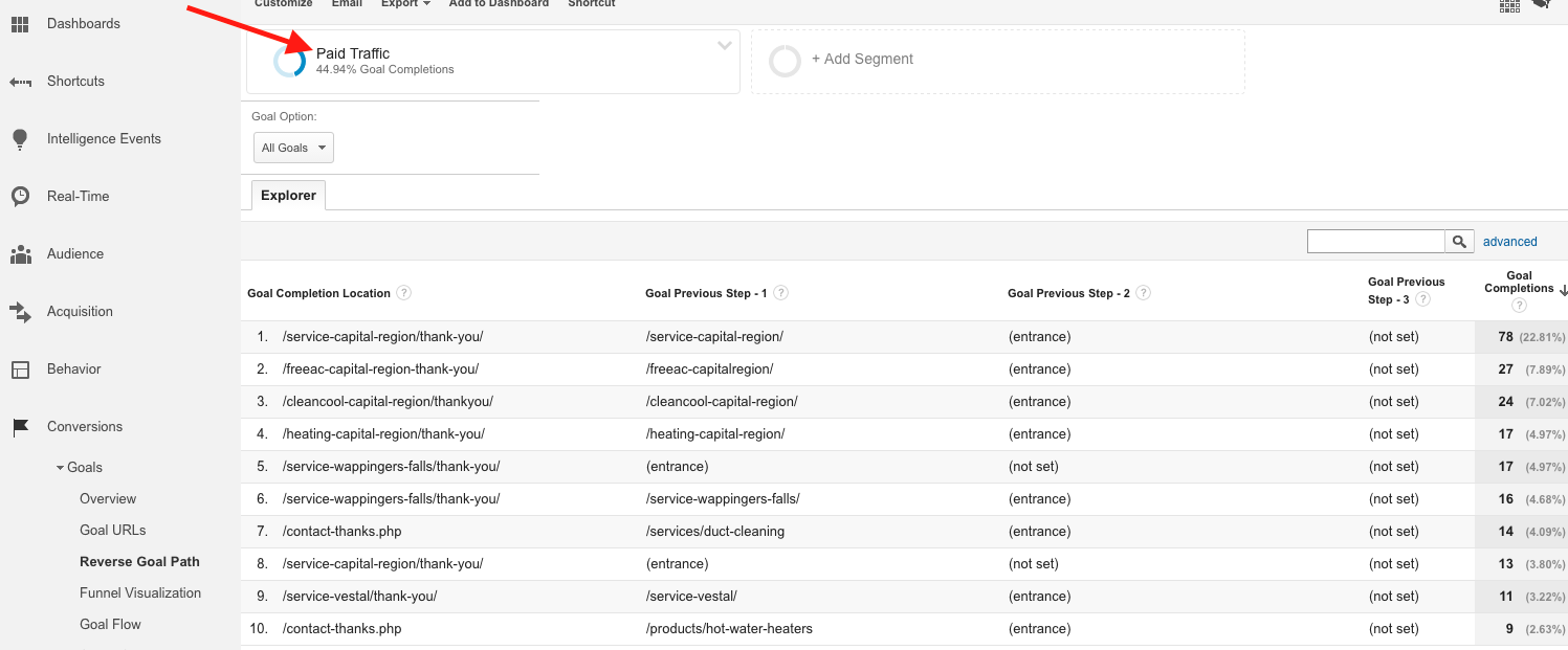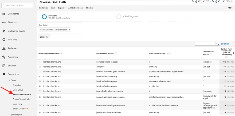 To access the Reverse Goal Path report, go to Conversions > Goals > Reverse Goal Path. In this example from an HVAC company, you’ll see a table of URL paths leading up to conversion, along with a completion count for each.