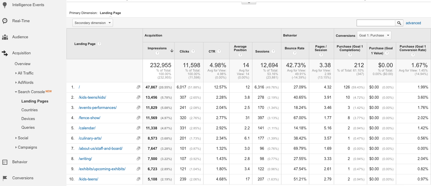 Once you’ve linked to an active Search Console account, you’ll see data appear under the Acquisition > Search Console section. Looking at the Landing Pages report (not to be confused with the report of the same name under Behavior), you’ll see a breakdown of URLs along with metrics for each. Here, we see an example of this report for an arts center promoting local classes.