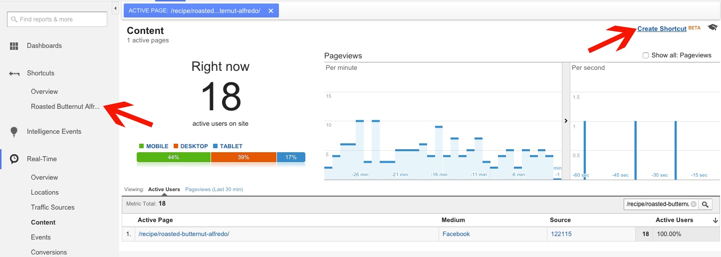 If you’d like to quickly look at real-time traffic to a certain page on your site, set up a shortcut within the Google Analytics interface. Simply navigate to the section of Real-Time Analytics where you’d like to return (in this case we clicked on a specific recipe page to filter to that URL) and click “Create Shortcut” in the upper right. You’ll now see a prompt to create a name for this shortcut and save it.