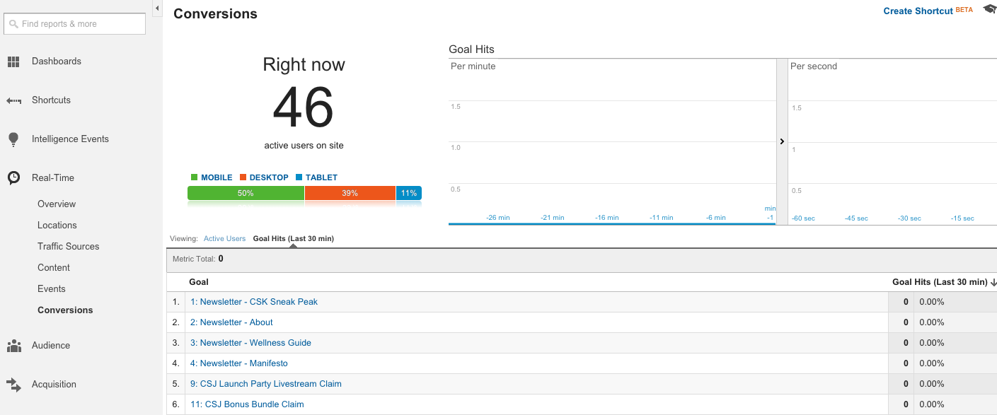 Under the Real-Time section you’ll see Events and Conversions with recent Events or Goals that have occurred for each, respectively. You’ll be able to see these for either active users or for those that have occurred within the last 30 minutes.