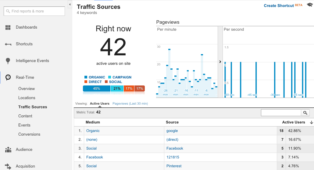 If you have a planned appearance on TV, such as an interview with your CEO, you’ll want to watch real-time analytics to see if traffic volume begins to pick up while he or she is speaking. You can also look at sources to see how people may be researching your brand; for instance, are they coming from search? Are they finding you on Facebook and then visiting your site? Use the Real-Time > Traffic Sources report to see specific sources listed with active users from each.