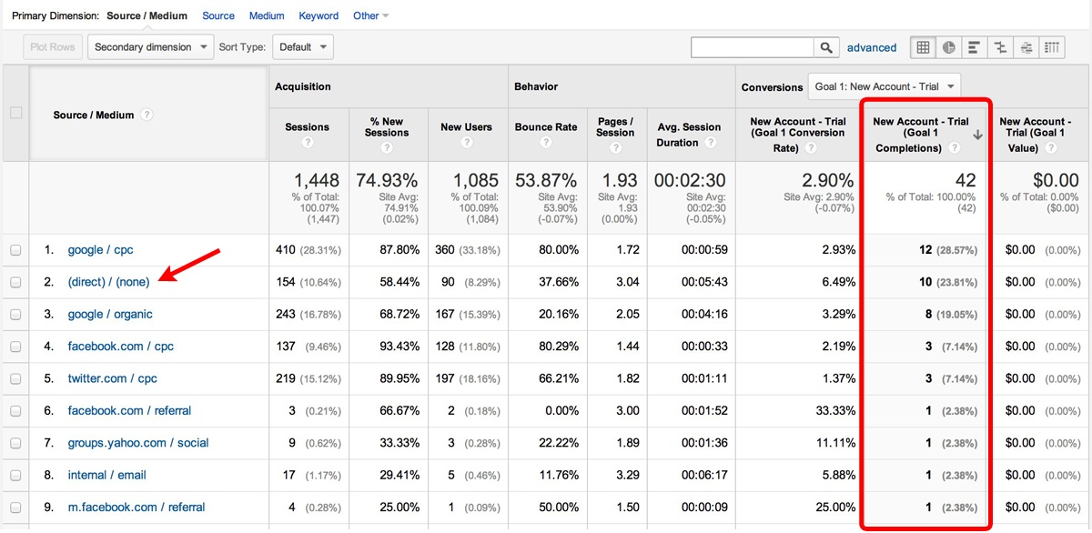 Above is the All Traffic report (Acquisition > All Traffic), sorted by goal completions. If you have multiple goals, you can select the goal that is displayed using the dropdown box labeled “Conversions.” Here, we have selected “New Account – Trial” as the goal, so the report shows where the visitors creating trial account came from.
