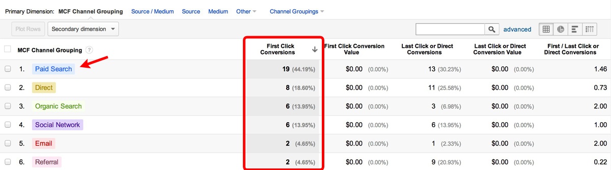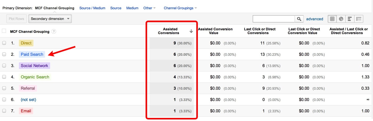 Now, the first column in the report shows the “Assisted Conversions” – the number of visits from a source that preceded a conversion visit. In this case, for example, we can see that Paid Search assisted in six conversions.