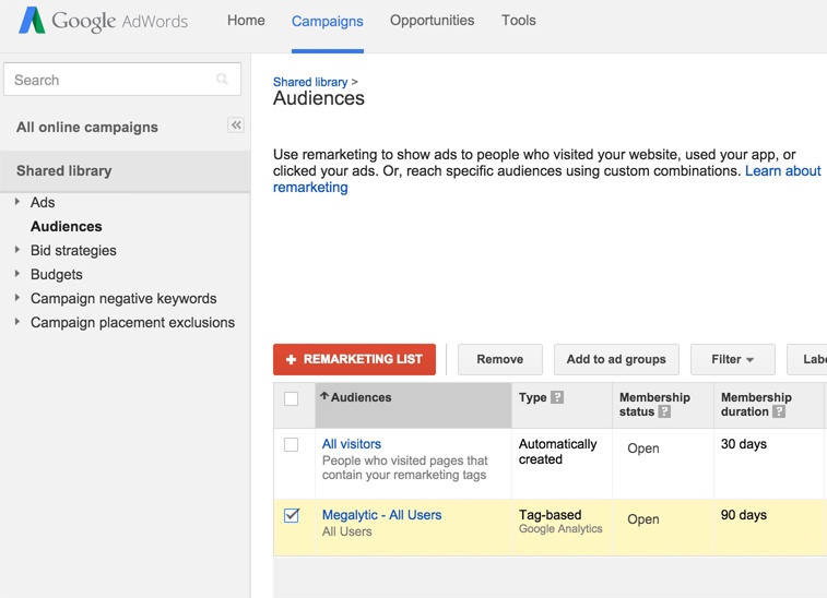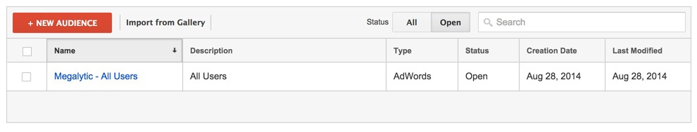 To use the remarketing list, we log into our AdWords account and navigate to the Shared Library. By clicking on “Audiences,” we can see our newly-created remarketing list – “Megalytic – All Users” – at the bottom of the table.