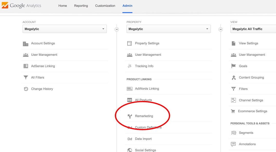 The first step is to create a remarketing list using Google Analytics. In the Admin panel, select Remarketing from the Property column.