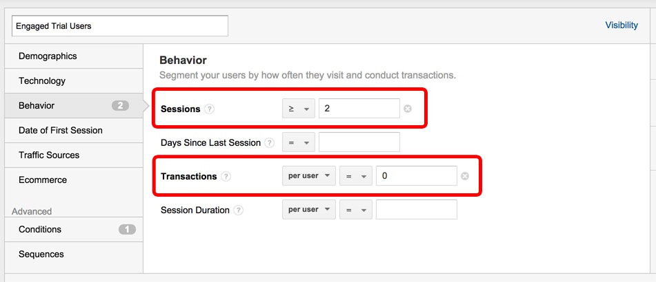 To do this, first create a segment that identifies engaged users. We are going to create a segment including users who have visited at least twice, have not purchased and who have signed up for a free trial.