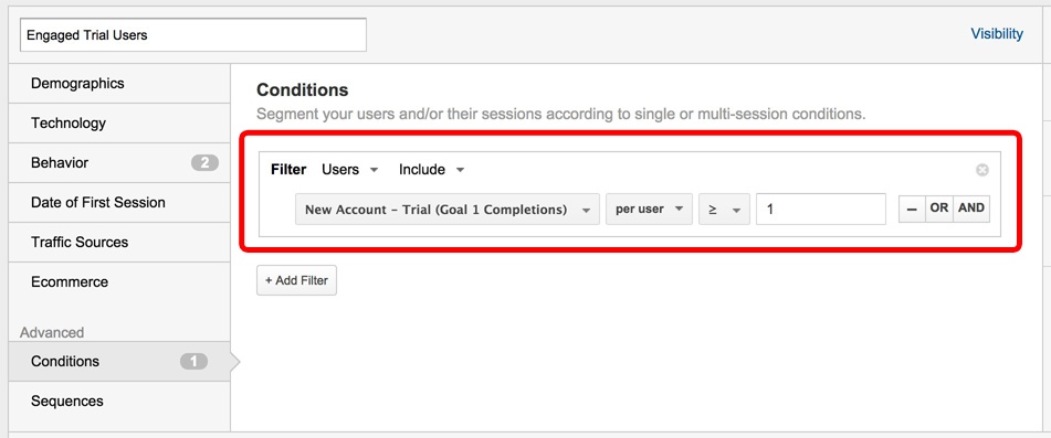 Under Advanced > Conditions, we have specified the goal “New Account – Trial” has been completed. We have named the segment “Engaged Trial Users.”