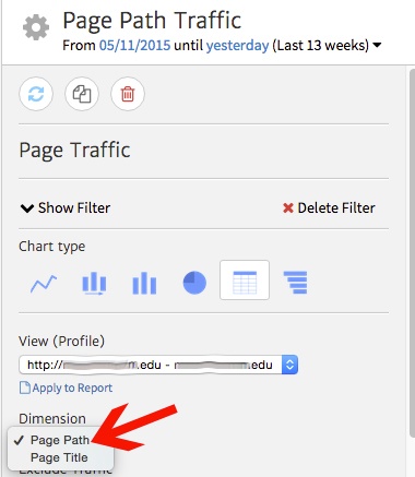 We’ll also change the Dimension to show Page Path instead of Page Title, so we see URLs instead of titles. You can choose either depending on how the site is set up, but for the purposes of this site, it’s more straightforward to identify the pages by showing the URLs.