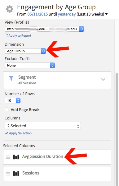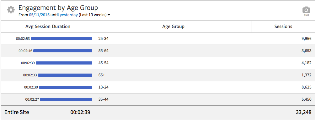 Megalytic offers an Engagement by Demographic widget to help display this information. After inserting this widget, customize it to show data by Age Group and choose Average Session Duration and Sessions for columns.