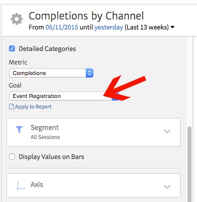 First, you will need to customize the widget, clicking the gear in the upper left to get to the options. Using the Goal dropdown, choose the specific Goal that you’d like to track. For this example, we’re going to take a look at Event Registration, which correlates to prospective students and parents who sign up to visit a campus open house.