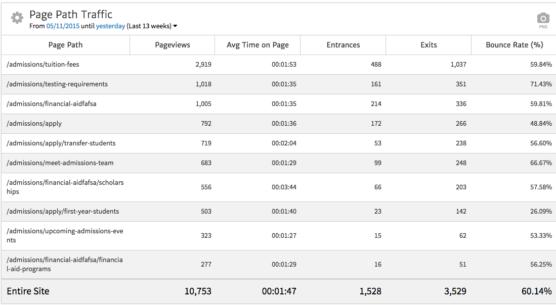 After all these settings have been applied, you’ll see a list of URLs from the Admissions section of the site, sorted to show those with the most pageviews. Here, we can make some observations as to what information is most appealing to prospective students.