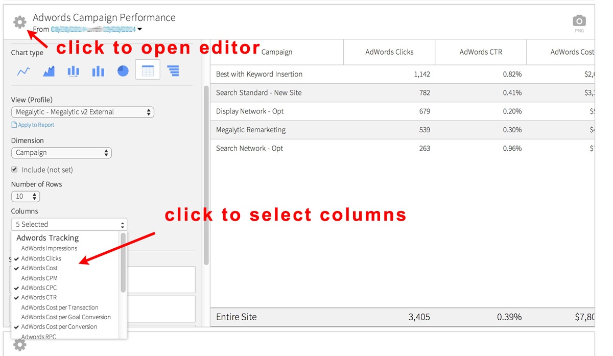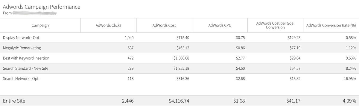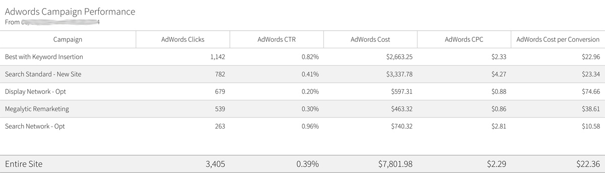 Once you have created your Paid Traffic report in Megalytic, scroll down to the table named “AdWords Campaign Performance.”