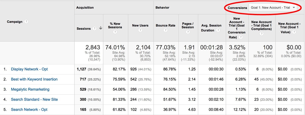 The most useful metric in this report is Completions. This tells us the number of visitors from each AdWords campaign that created a trial account. You’ll note that overall, the Completions during this time period is 100.