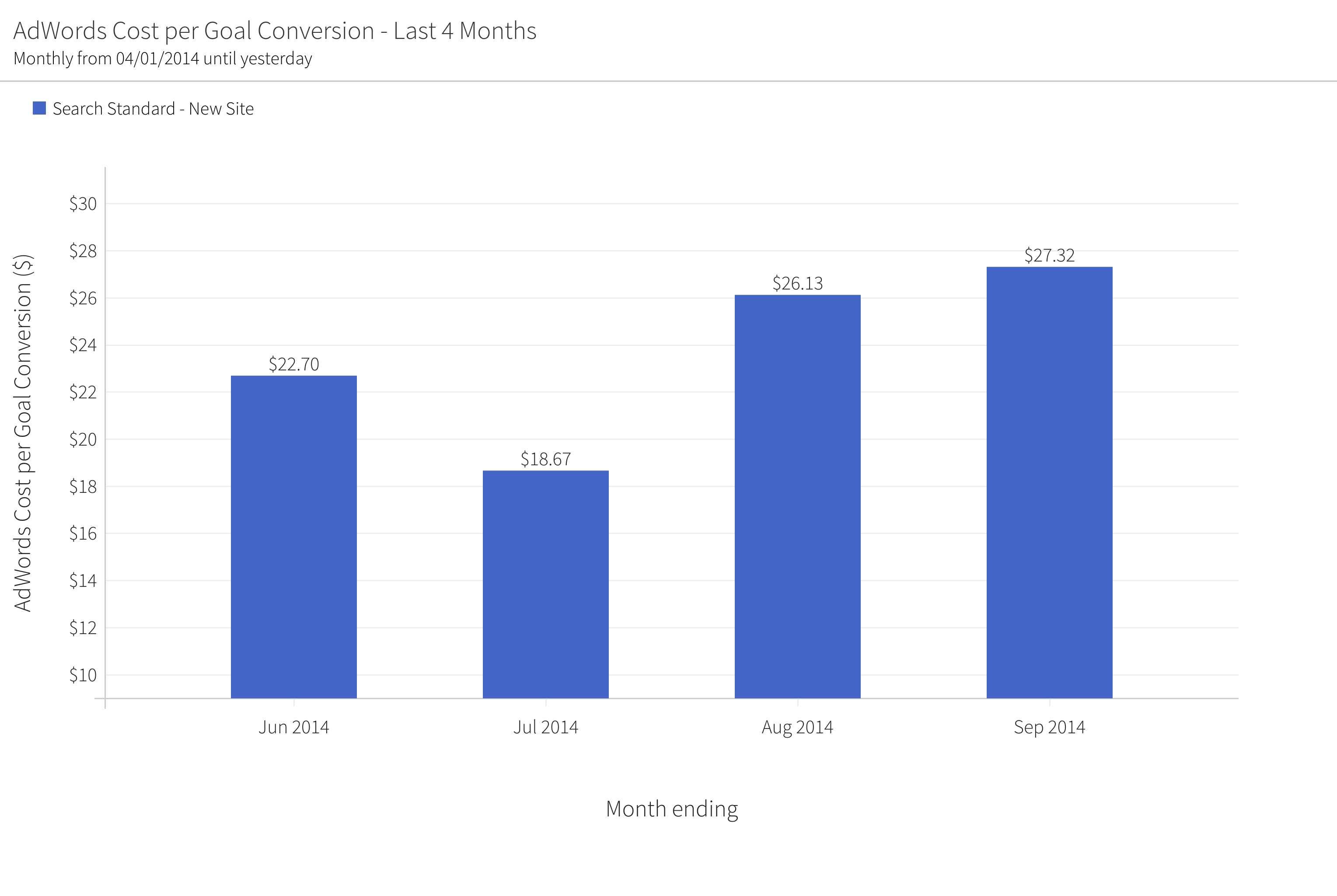 Here’s what the AdWords Cost per Goal Conversion looks like over the last four months for another campaign. The cost has been creeping up because we’ve been increasing bids to grow the click volume.