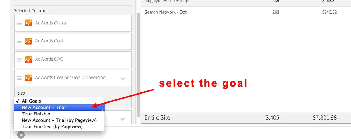 Next, we select the two columns that relate to goals – AdWords Cost per Goal Conversion and AdWords Conversion Rate – and use the goal selector shown below to set these columns to use the “New Account – Trial” goal. You will want to select the goals that matter to your business and that you have defined in Google Analytics.
