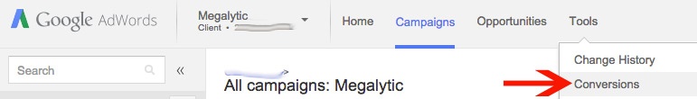 AdWords provides a simple step-by-step process for setting up a conversion. Within your AdWords account, click Tools from the navigation bar and select Conversions from the dropdown menu.