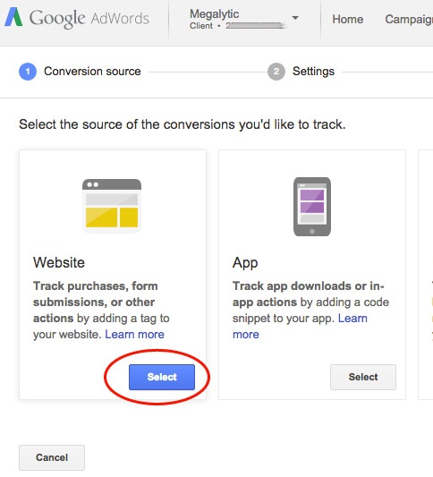 When you start creating a new conversion, you’ll see several options for conversion sources. For this example (tracking a form submission), we’ll choose Website.