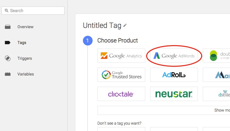 You’ll now see a list of several types of tags you can create. Choose Google AdWords.