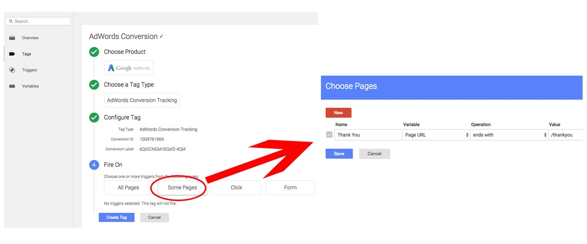 Finally, in the fourth (“Fire On”) section, you can choose when to fire the conversion tracking code. If your site serves a “Thank You” page to users who submit the form, select “Some Pages.” In the box that pops up, create a trigger based on the page that should fire the conversion.