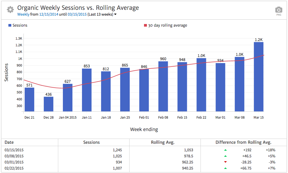 The owner of a company doesn’t have much time to read and will likely skim a report. You want to be able to summarize the metrics that will mean the most to him or her, making any successes stand out. For example, the below graph shows growth in organic traffic over the last few months. While the CEO may not care about week-by-week numbers, he or she should care about seeing the red line trend upward.