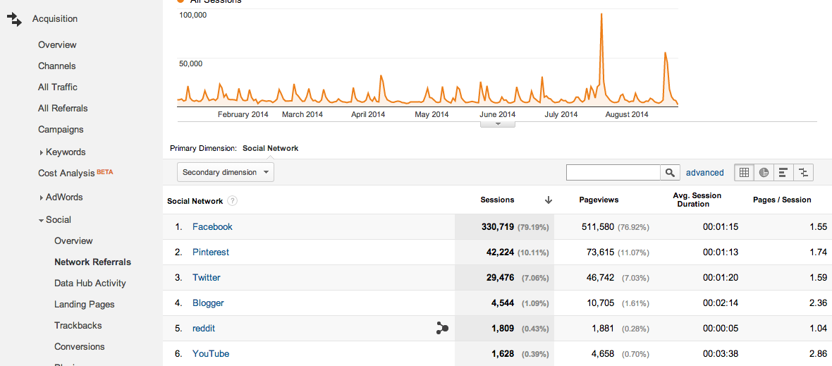 In this example, we’ve clicked on the URL for the brownie recipe to see more specific statistics. You can see this link shared to a large audience starting August 21, with Facebook providing by far the most volume of sessions, followed by Pinterest, and then Twitter. On that day, a significant quantity of people clicked to see the recipe, and the volume tapered down in the following days.