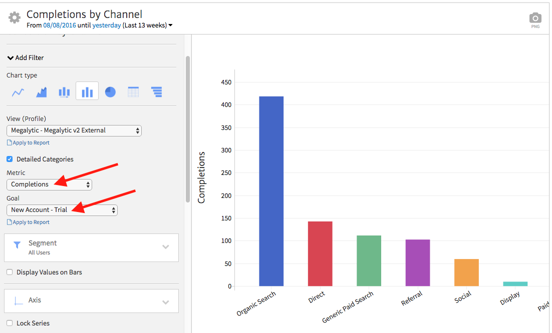 Whenever possible, focus on showing conversion-related metrics. For instance, in this example we want to break down conversion volume by channel to show how they stack up against each other in driving free trials. We’ll use the Completions by Channel widget. In the widget options, we’ll leave Completions as the metric and choose the Goal we want (in this case, “New Account - Trial,” representing trial signups).