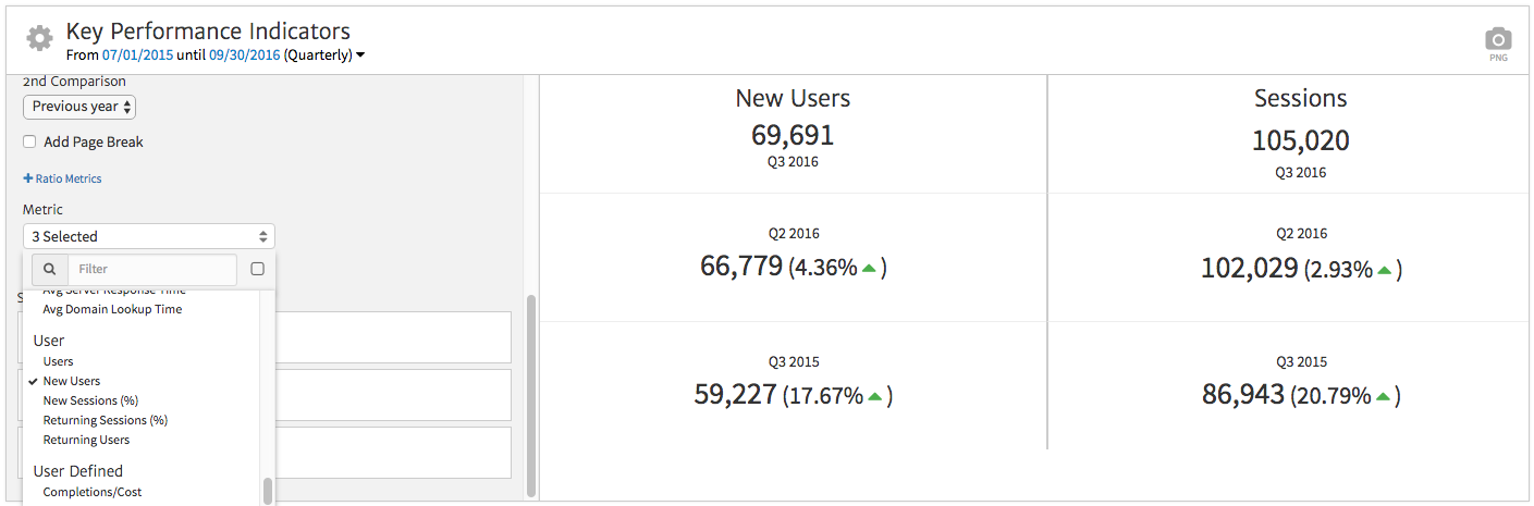 Below is an example of configuring the Multi-KPI widget, in which we’ve selected some traffic-based metrics to put at the top of our report. Within the widget options, use the “Metric” dropdown to select from most metrics available in Google Analytics.