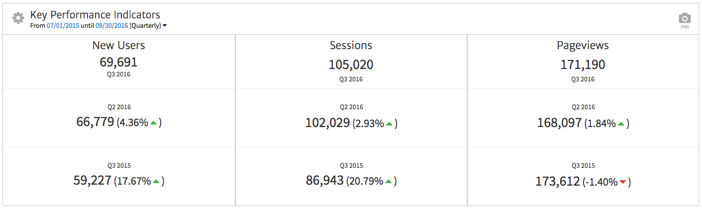 The KPI widget in Megalytic provides a simple way to show high level metrics at the top of your report, comparing against the previous period and previous year. Use the Multi-KPI widget to show up to four metrics side by side.