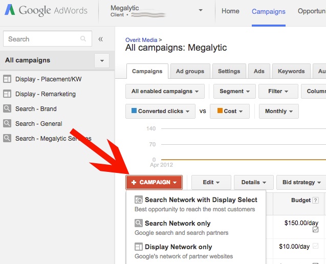 Knowing this, let’s start by setting up a new campaign from the within AdWords. To do so, we’ll select the red “Campaign” button and choose the campaign type we want. For the purposes of this example, we’ll build a Search Network Only campaign.