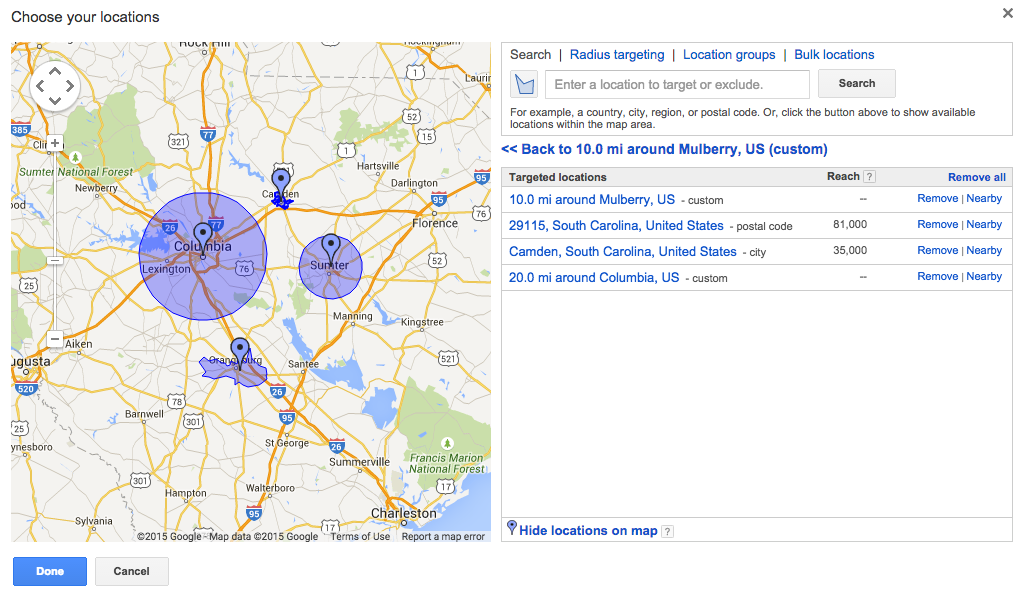 In this example, we’ve chosen to target a 20 mile radius around Columbia, South Carolina. Google shows you a shaded area on the map where ads will be eligible to appear.