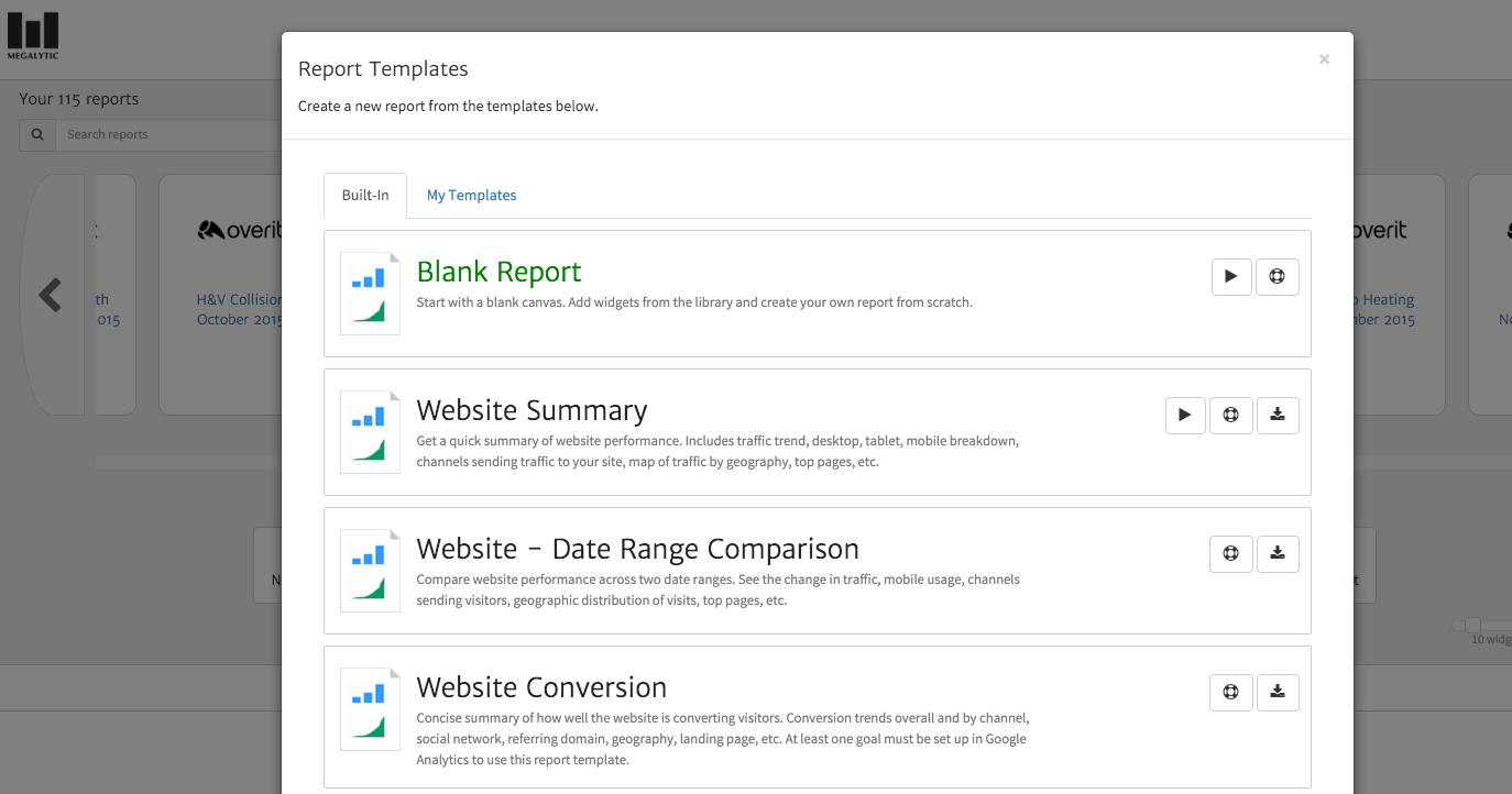 Megalytic allows you to create custom analytics report templates that include the precise data you want to show. You can start with a built-in template or build one from scratch, tweaking it to present just the data that’s important to your client. For more, see our post on Top Monthly Report Templates.
