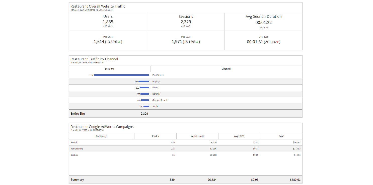 With a consistent template, anyone reviewing a report will know exactly where to look for a specific data point each time. For instance, the marketing manager will know to look at the top of the report for high-level user and session totals, followed by a table showing traffic by channel, while an SEO manager will know exactly where to view keyword reports and search console data.