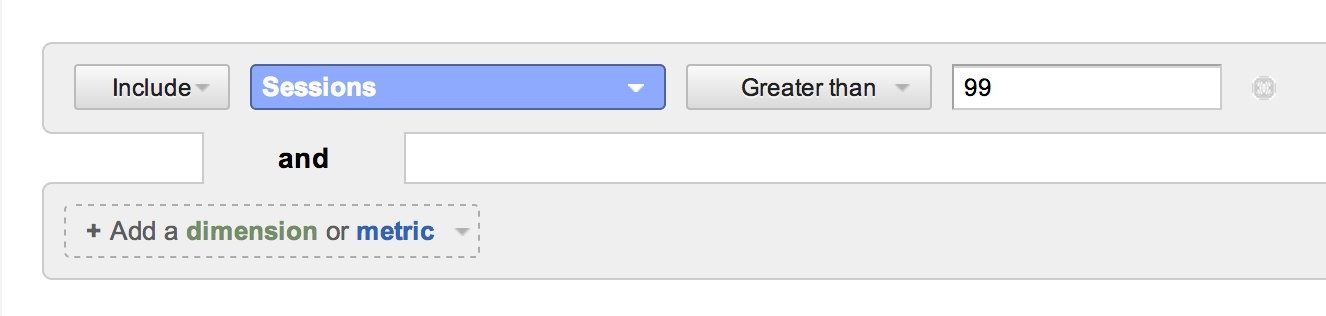 To find your low-traffic / high conversion rate countries, start with the report above and sort by the conversion rate column. You probably want to throw out countries with very small numbers of visits, as these are not statistically significant. To do so, use an advanced filter like the one shown below, which only includes countries with 100 or more visits.